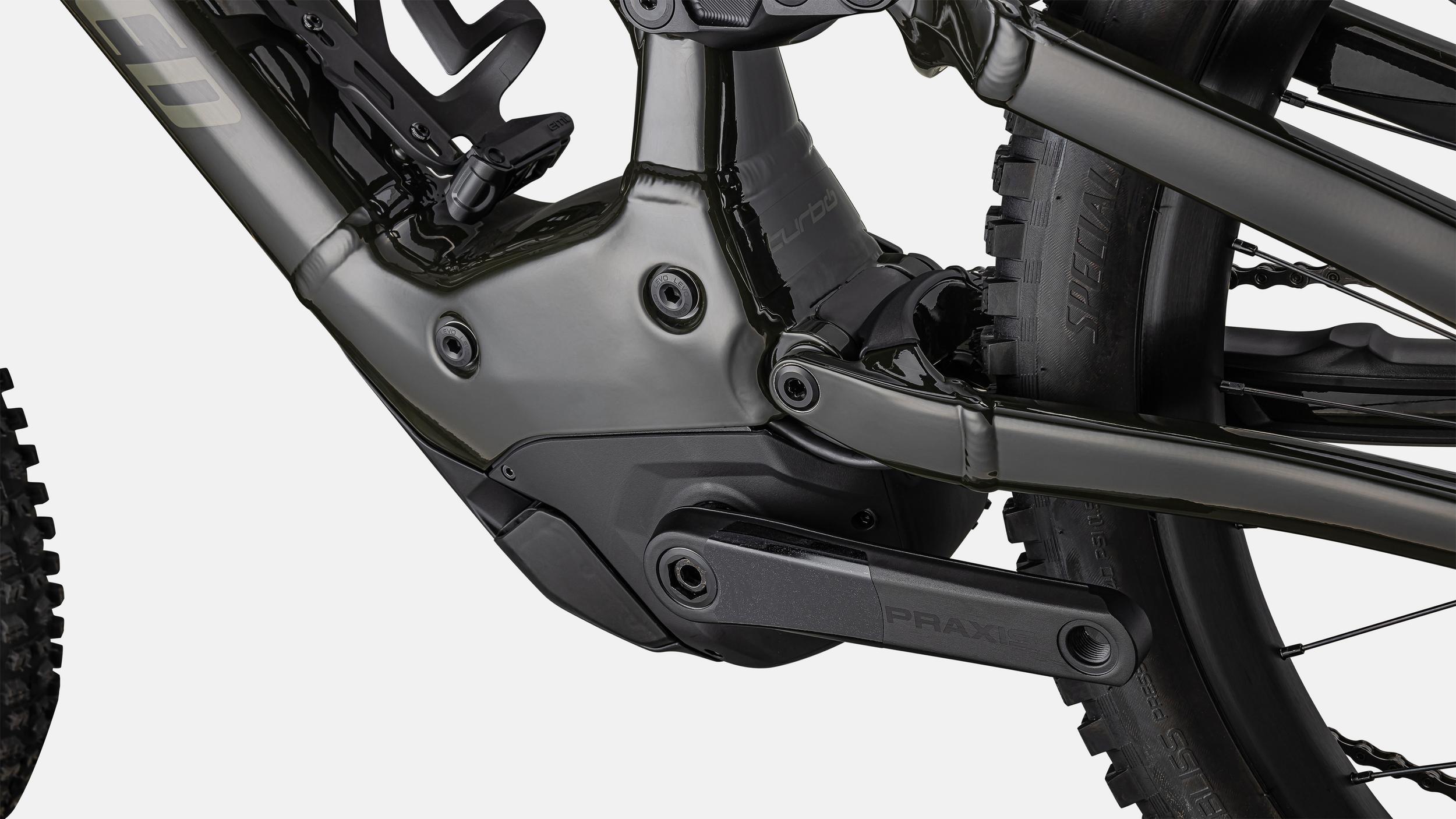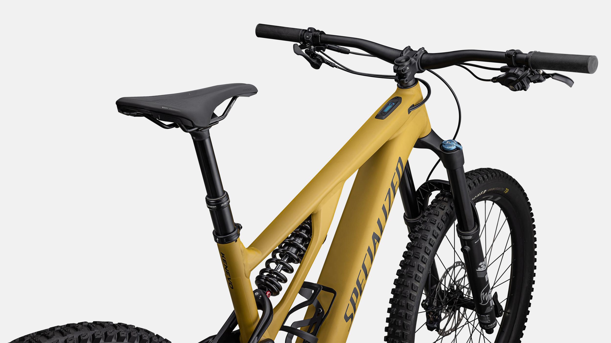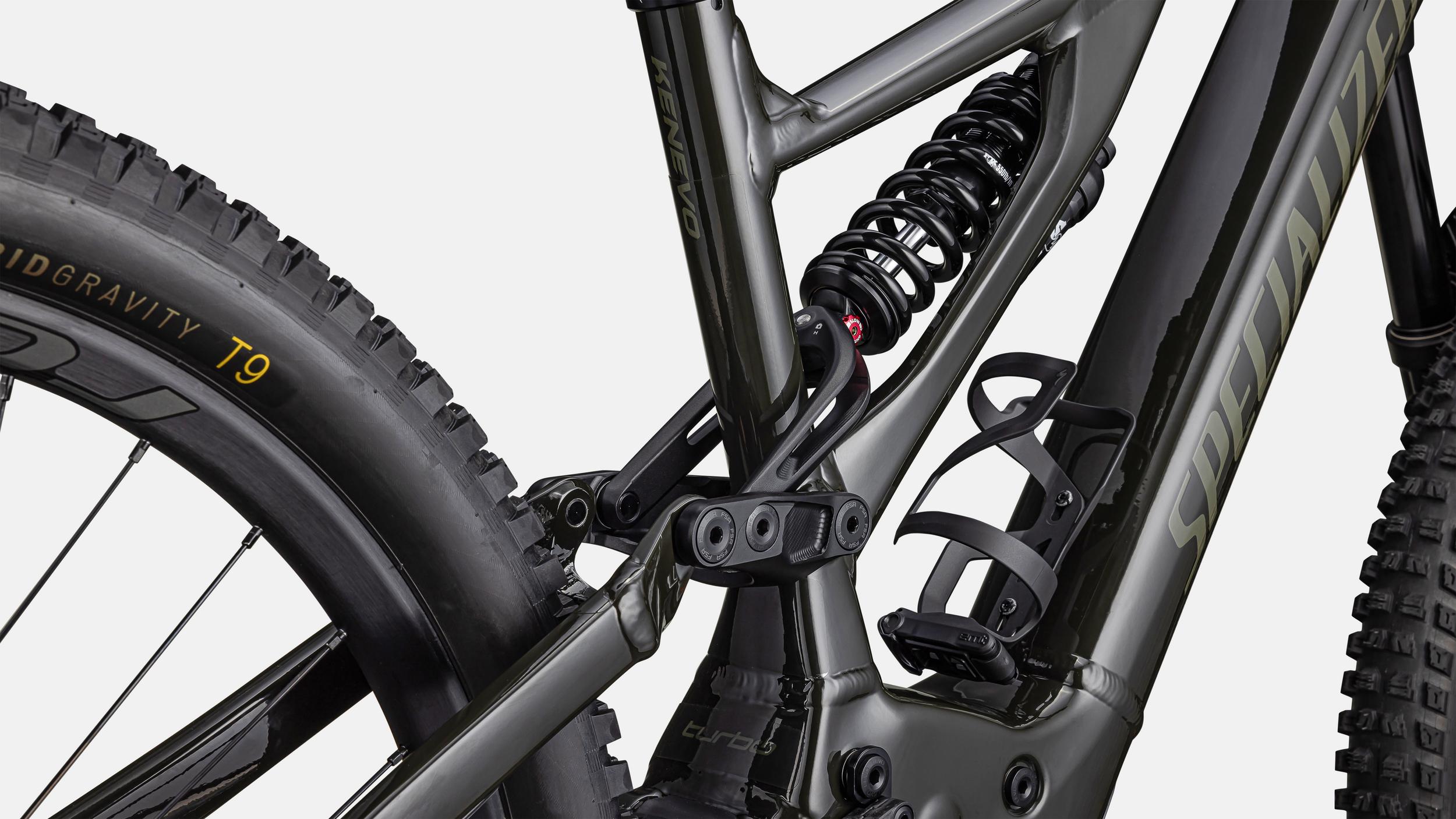 - El marco completamente rediseñado de aleación del Kenevo cuenta con un frente y una parte trasera de aleación M5, un diseño asimétrico Sidearm y una nueva trayectoria de eje y curva de palanca que brindan a la bicicleta niveles insanos de control en los senderos más desafiantes.