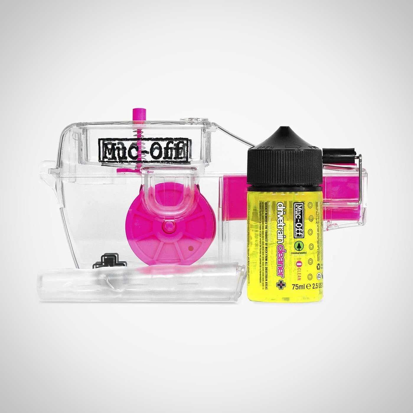 Incluido en el kit es una medida de 75ml de Muc-Off Drivetrain Cleaner. Este pequeño y revolucionario líquido puede pulverizarse sobre la transmisión o verterse directamente en el depósito superior de la máquina, que luego se libera con un botón de control. Esto garantiza que la aplicación del limpiador sea rápida y fácil de controlar. La máquina X-3 y el Drivetrain Cleaner se asocian para atacar lo peor de la grasa y la mugre desde todos los ángulos posibles para ofrecer la máxima limpieza profunda incluso en las cadenas de bicicleta más sucias.